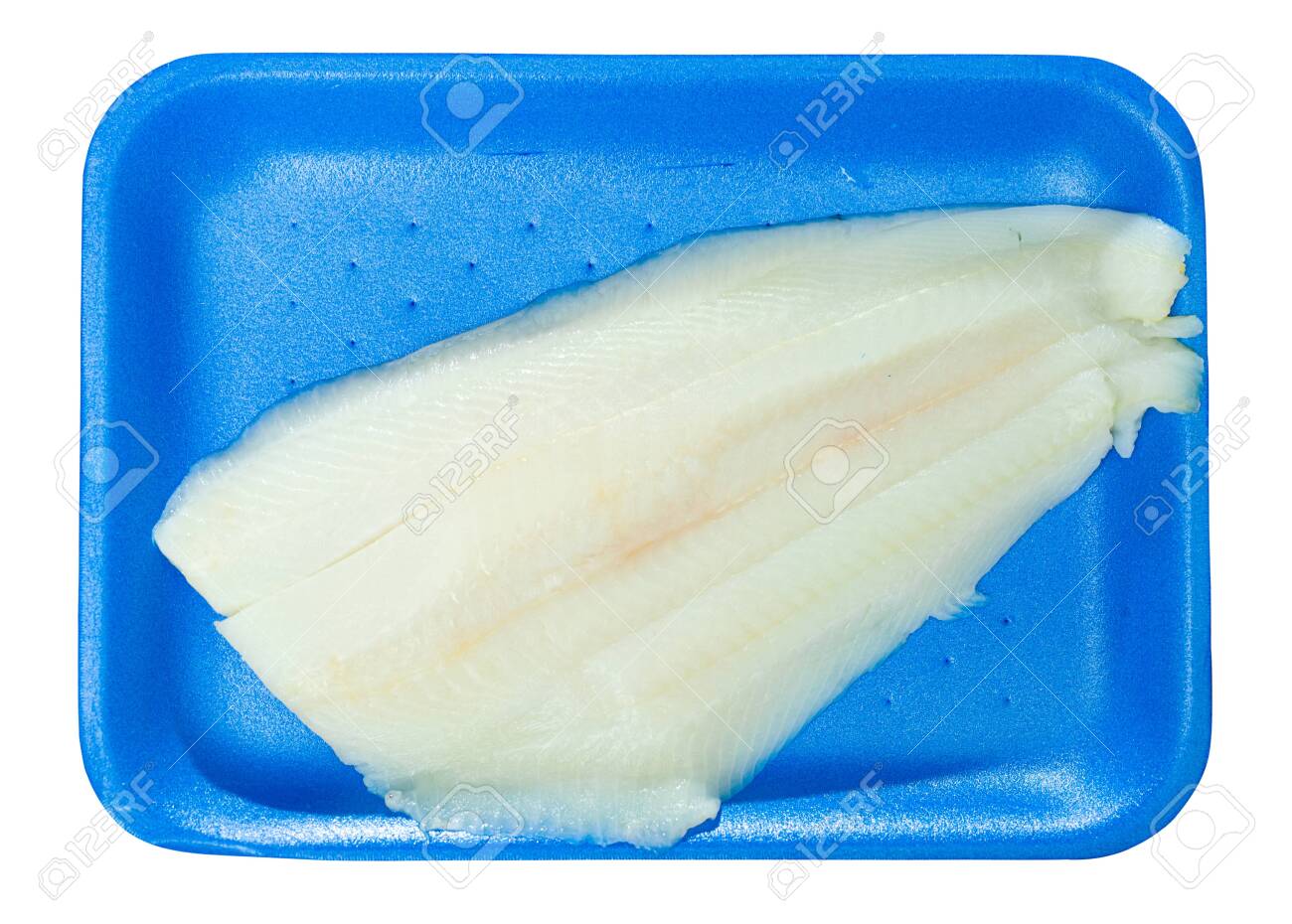 Immagini Stock Raw Seafood Fresh Halibut Fish On Plastic Blue Disposable Platei Isolated Over White Background Image 148867953