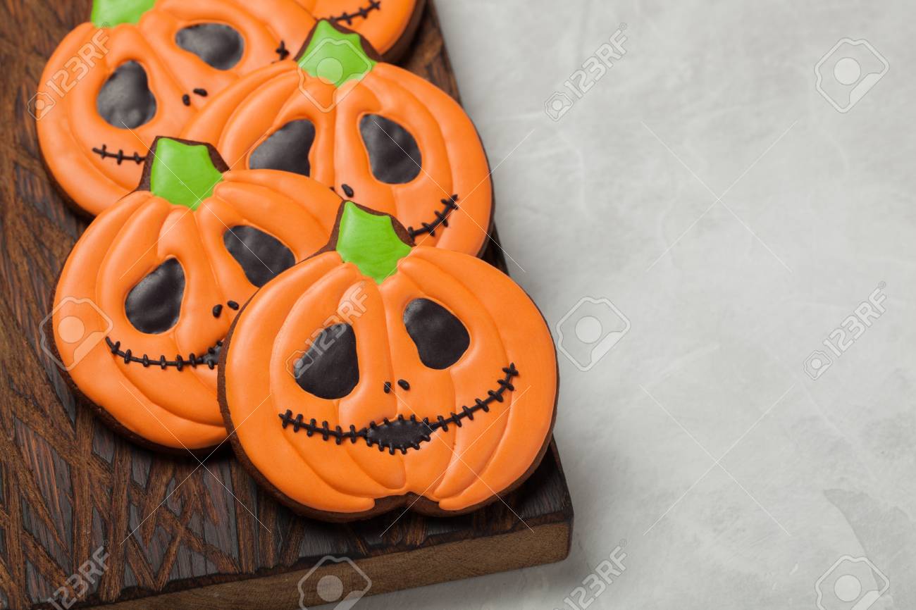 Immagini Stock Biscotti Di Zenzero Fatti In Casa A Forma Di Zucche Per Halloween Sul Fondo Concreto Piu Leggero Vista Superiore Con Spazio Di Copia Image 87868703