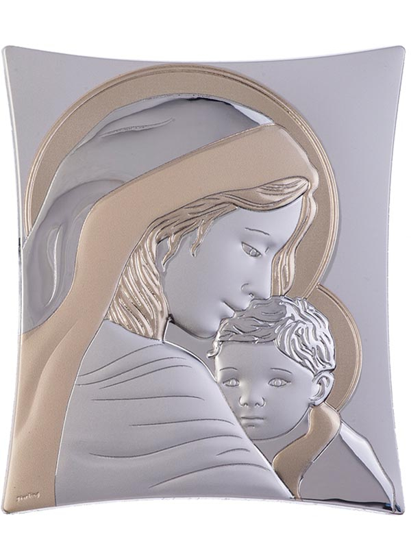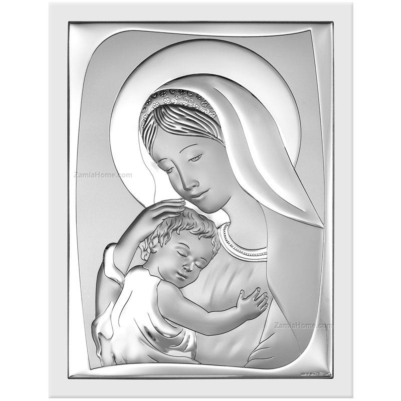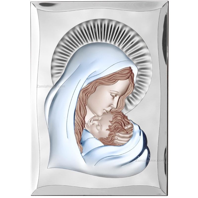 Icona Della Madonna Con Bambino In Braccio In Argento Oro Bilaminato