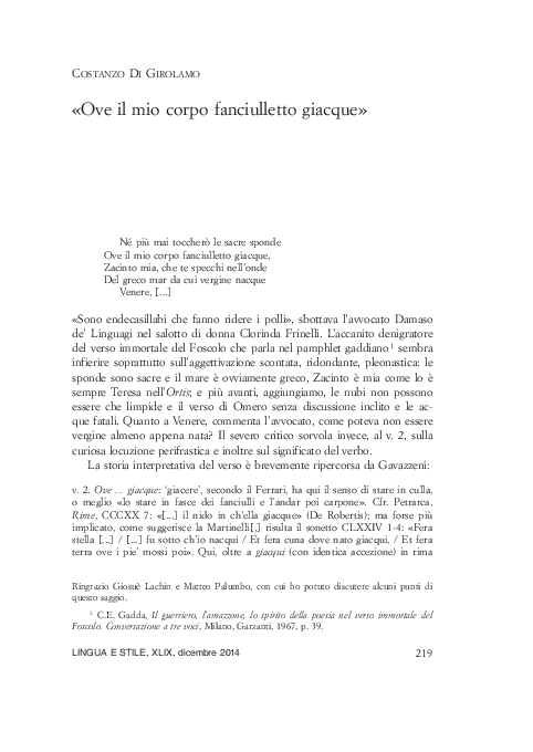 Pdf Costanzo Di Girolamo Ove Il Mio Corpo Fanciulletto Giacque Lingua E Stile 49 2014 219 235 Costanzo Di Girolamo Academia Edu