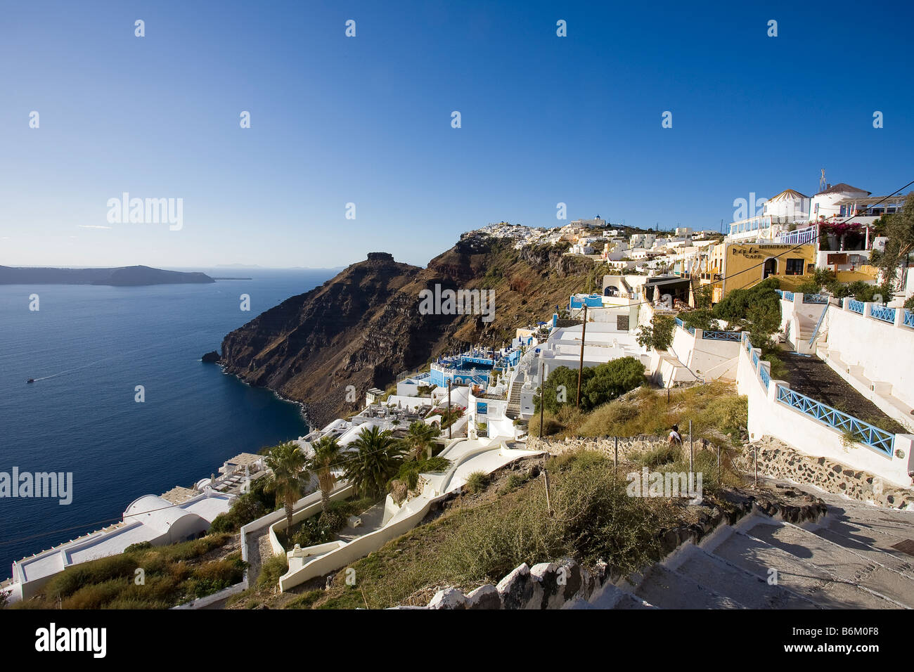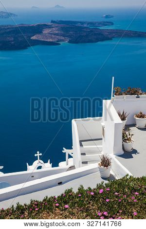 Immagini Stock Citta Imerovigli Sulla Scogliera Piu Alta Della Caldera Isola Di Santorini In Grecia Vista Sul Mare Egeo Image 32104148