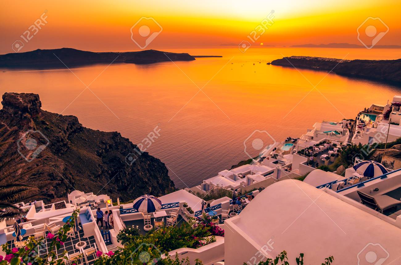 Immagini Stock Santorini Isole Cicladi Grecia Tramonto Sopra Imerovigli Vicino Alla Citta Di Thira E Firostefani Image 82259575