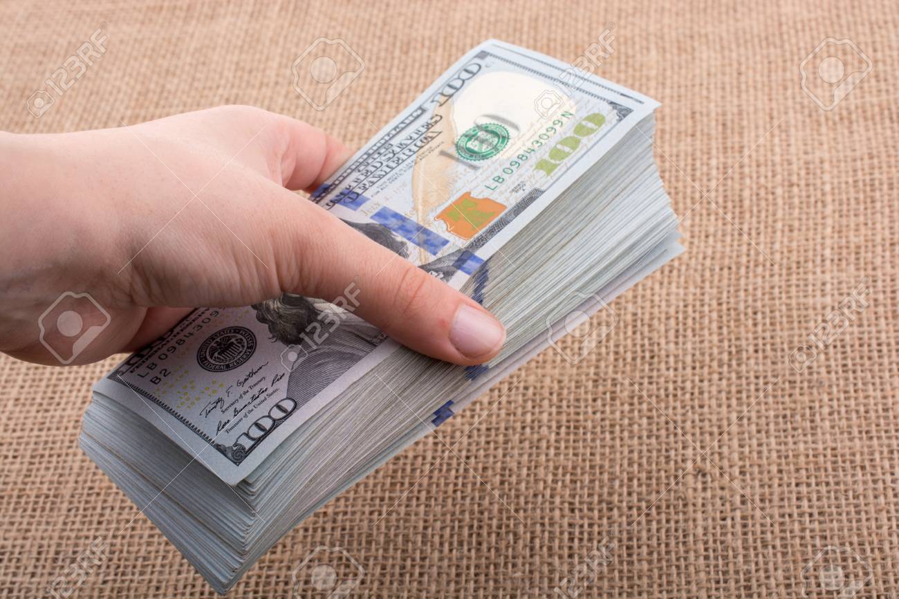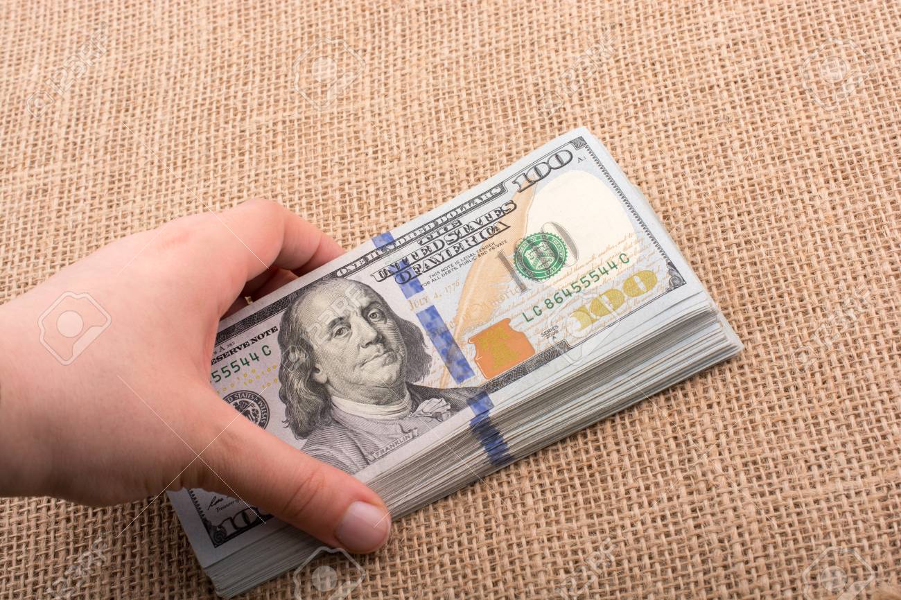 Immagini Stock Mano Che Tiene La Banconota Del Dollaro Del Dollaro Americano Su Uno Sfondo Di Tela Di Lino Image 86174417