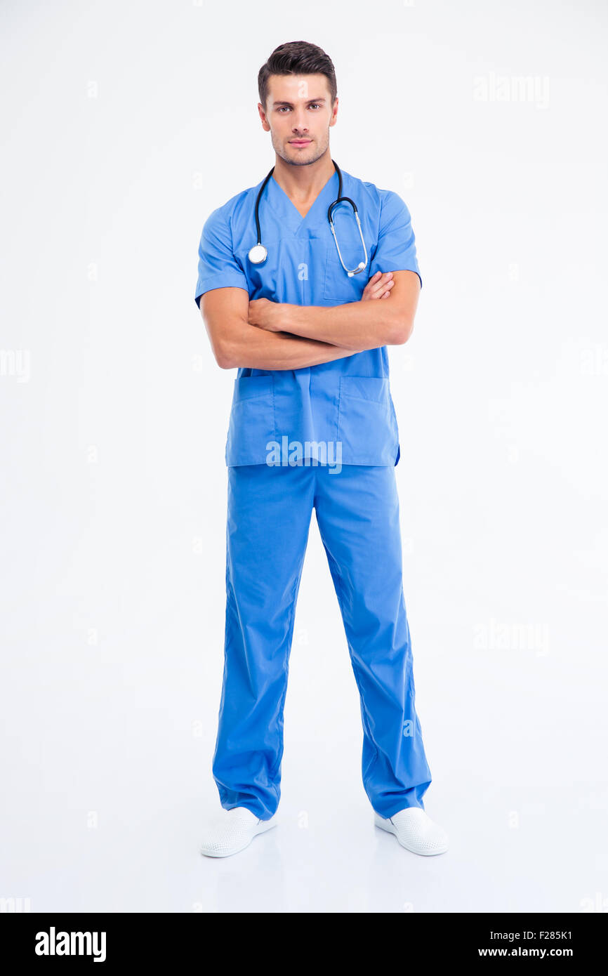 A Piena Lunghezza Ritratto Di Un Bel Maschio Di Dottore In Piedi Con Le Braccia Incrociate Isolato Su Uno Sfondo Bianco Foto Stock Alamy