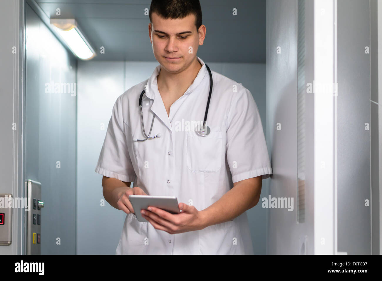 Foto Luminose Dei Maschi Di Dottore In Uniforme Con Uno Stetoscopio Proveniente Dall Ascensore E Utilizzando Computer Tablet In Ospedale Moderno Concetto Medico Foto Stock Alamy
