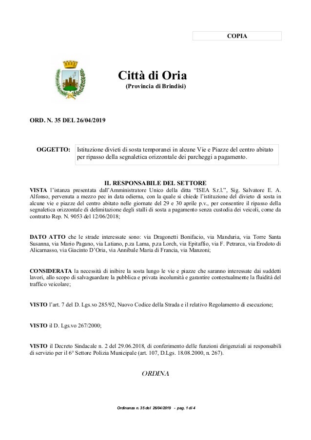 Oria Ordinanza Polizia Locale Per Divieto Di Sosta Rifacimento Stri