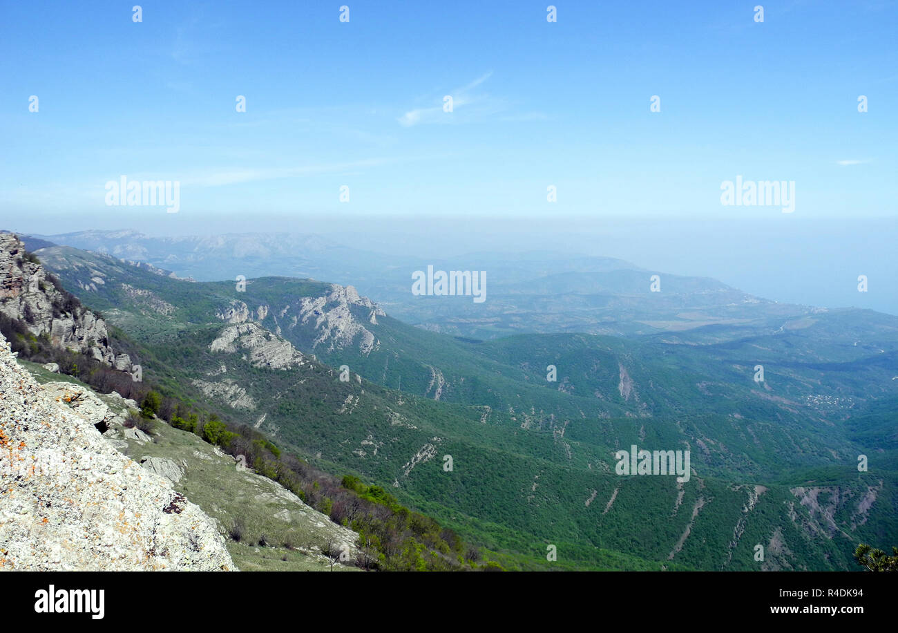 Bellissimo Paesaggio Di Montagna Con Vista Dall Alto Di Una Foresta Lontana Pendenze Coperte Mare Di Gran Lunga Inferiore All Orizzonte Montagne Di Crimea Foto Stock Alamy