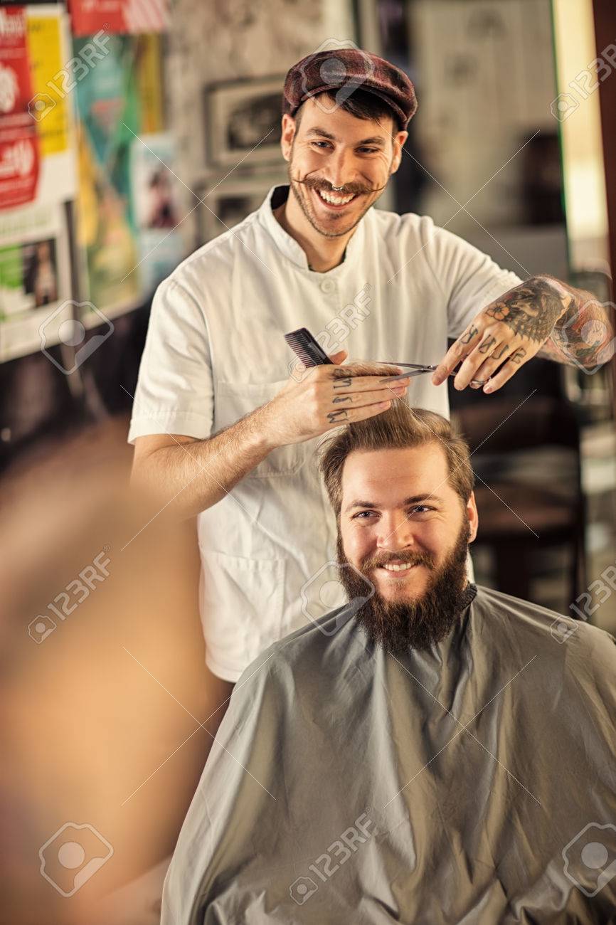 Immagini Stock Sorridente Uomo Parrucchiere E Il Taglio Di Capelli Di Cliente Image 53597160