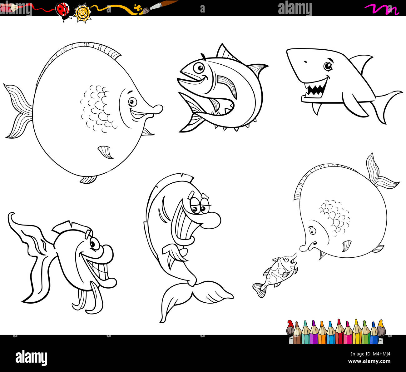 Funny Cartoon I Pesci Nuotano In Un Acquario In Fondo La Polpa Di Granchio Alghe E Decorazione Viene Fatta Una Sagoma Nera Per Un Libro Da Colorare Immagine E Vettoriale Alamy