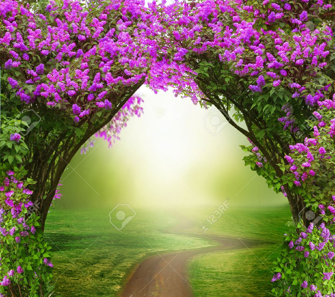 Immagini Stock Priorita Bassa Di Fantasia Magic Foresta Con Alberi Di Primavera Road Beautiful Landscape Lilac In Fiore Image 73113727