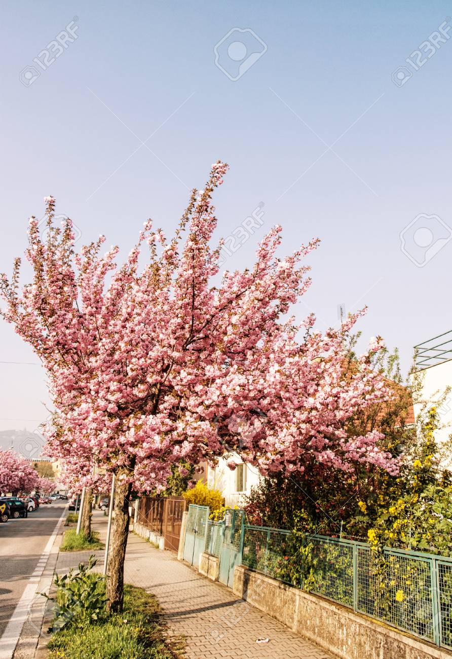 Immagini Stock Fioritura Albero Di Sakura In Strada Scena Di Primavera Filtro Fotografico Retro Image 75303821