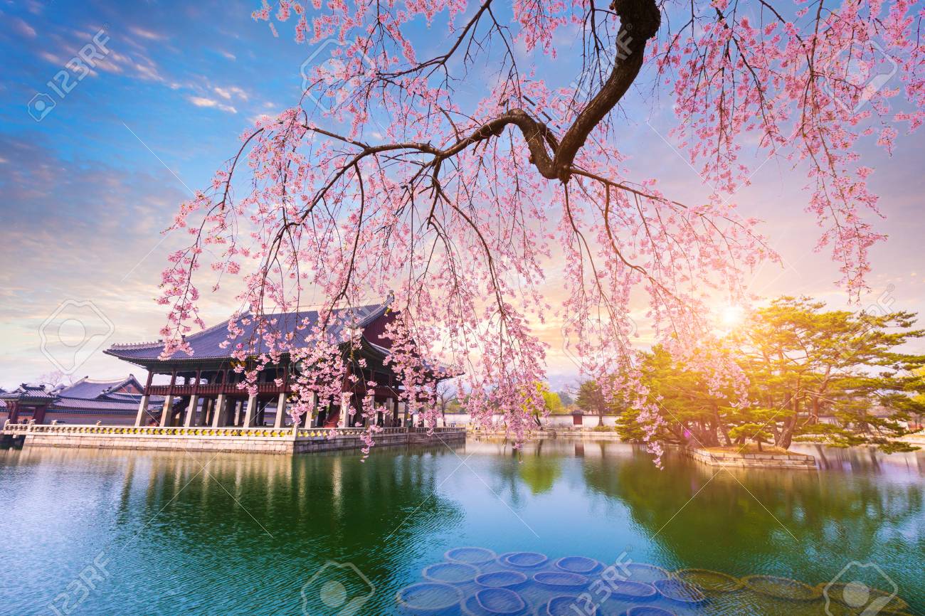 Immagini Stock Palazzo Di Gyeongbokgung Con Albero Di Ciliegio In Primavera In Citta Di Seoul Di Corea Corea Del Sud Image 77284026