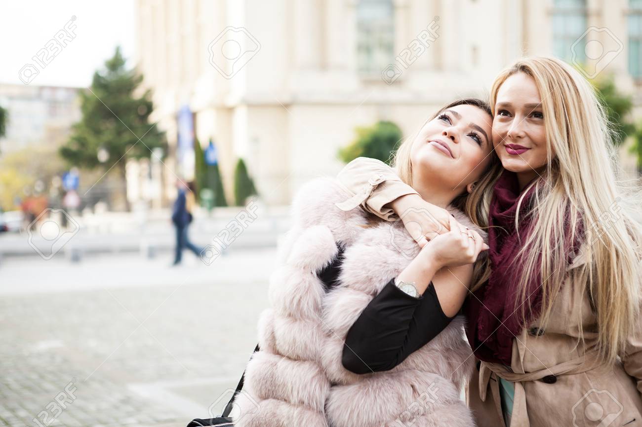 Immagini Stock Le Migliori Amiche Donne In Citta Che Si Abbracciano E Si Divertono Sorriso E Felicita Image 90597143
