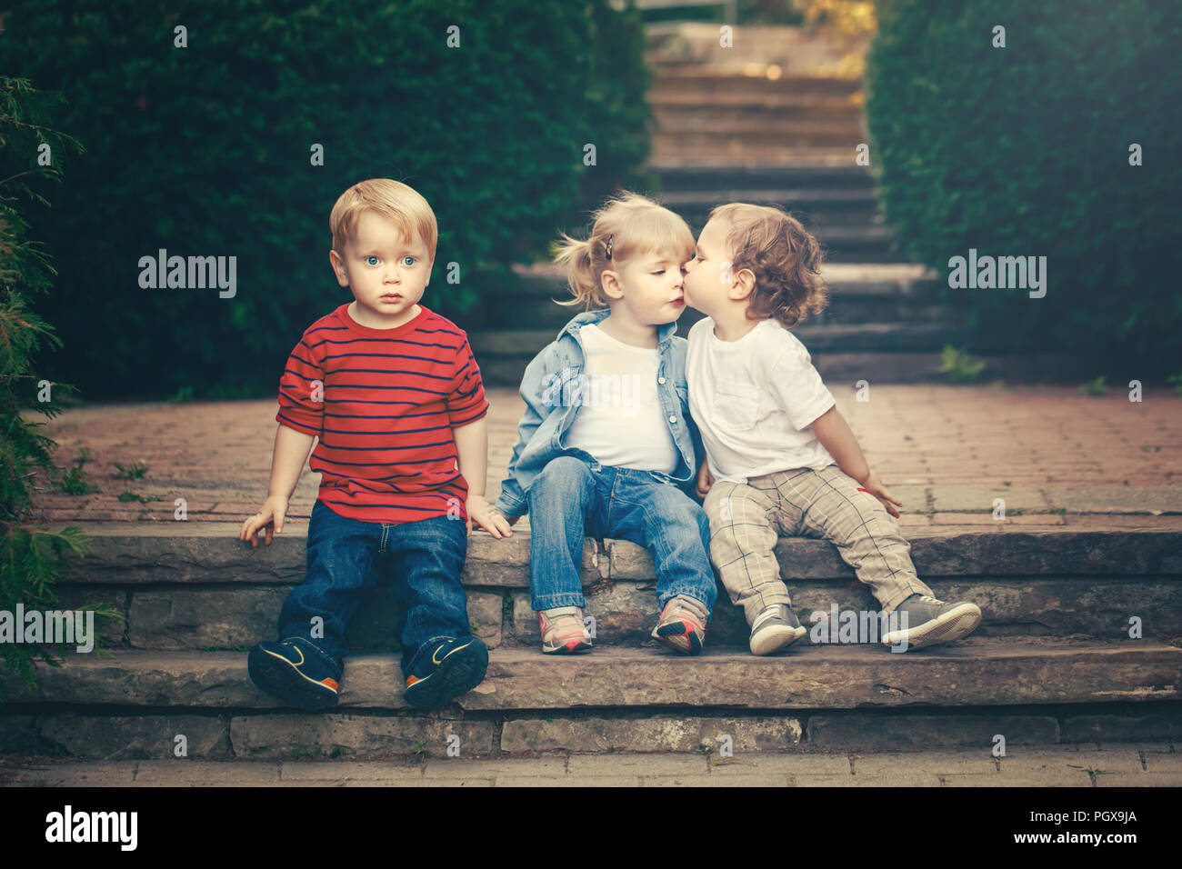 Gruppo Di Tre Graziosi Funny Adorabili Caucasico Bianco Bambini Bimbi Ragazzi Ragazza Seduta Insieme Kissing Ogni Altro Amore Gelosia Amicizia Infanzia Foto Stock Alamy