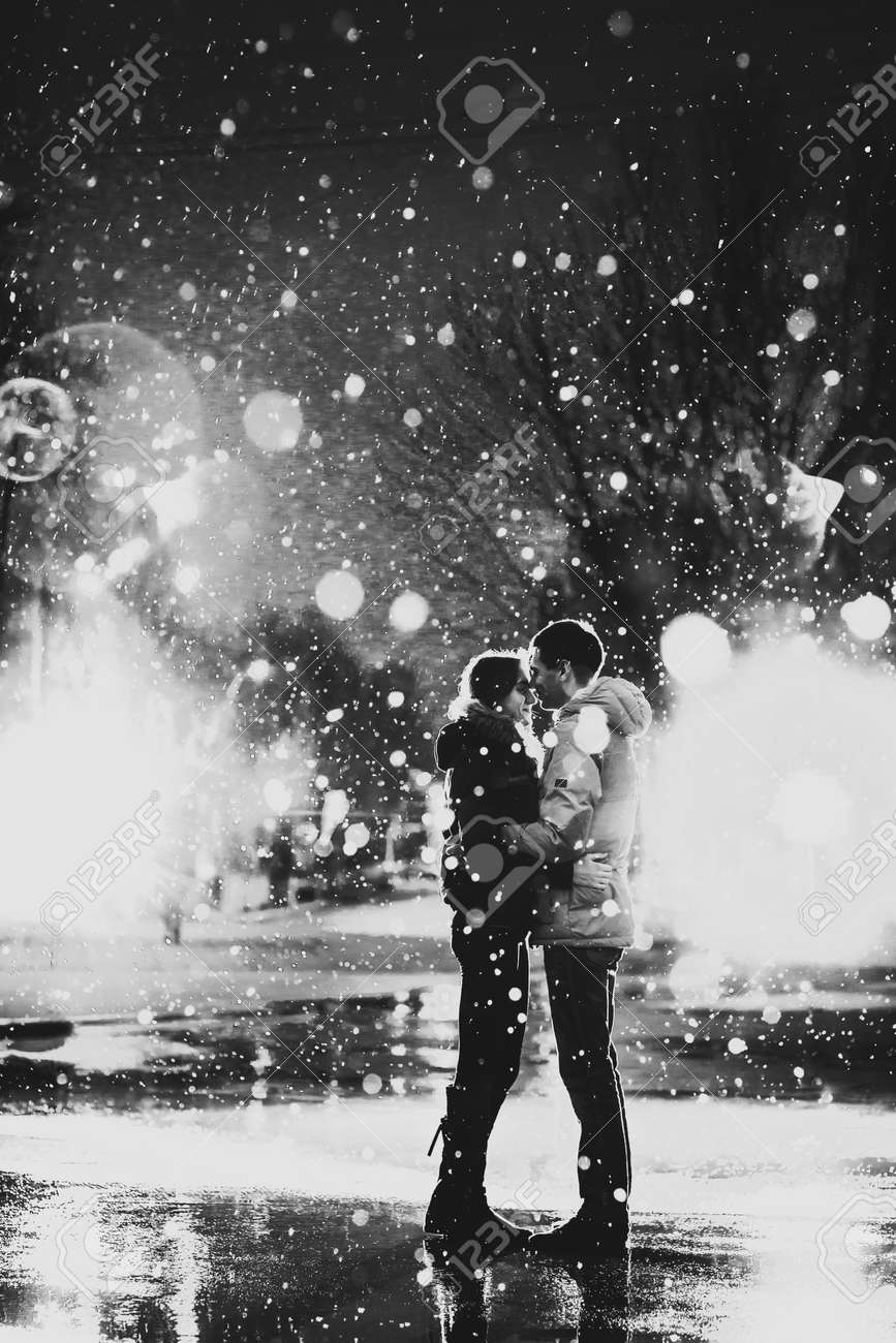 Immagini Stock In Amore Coppia Nella Neve Alla Citta Di Notte Strada In Bianco E Nero Image 38746663