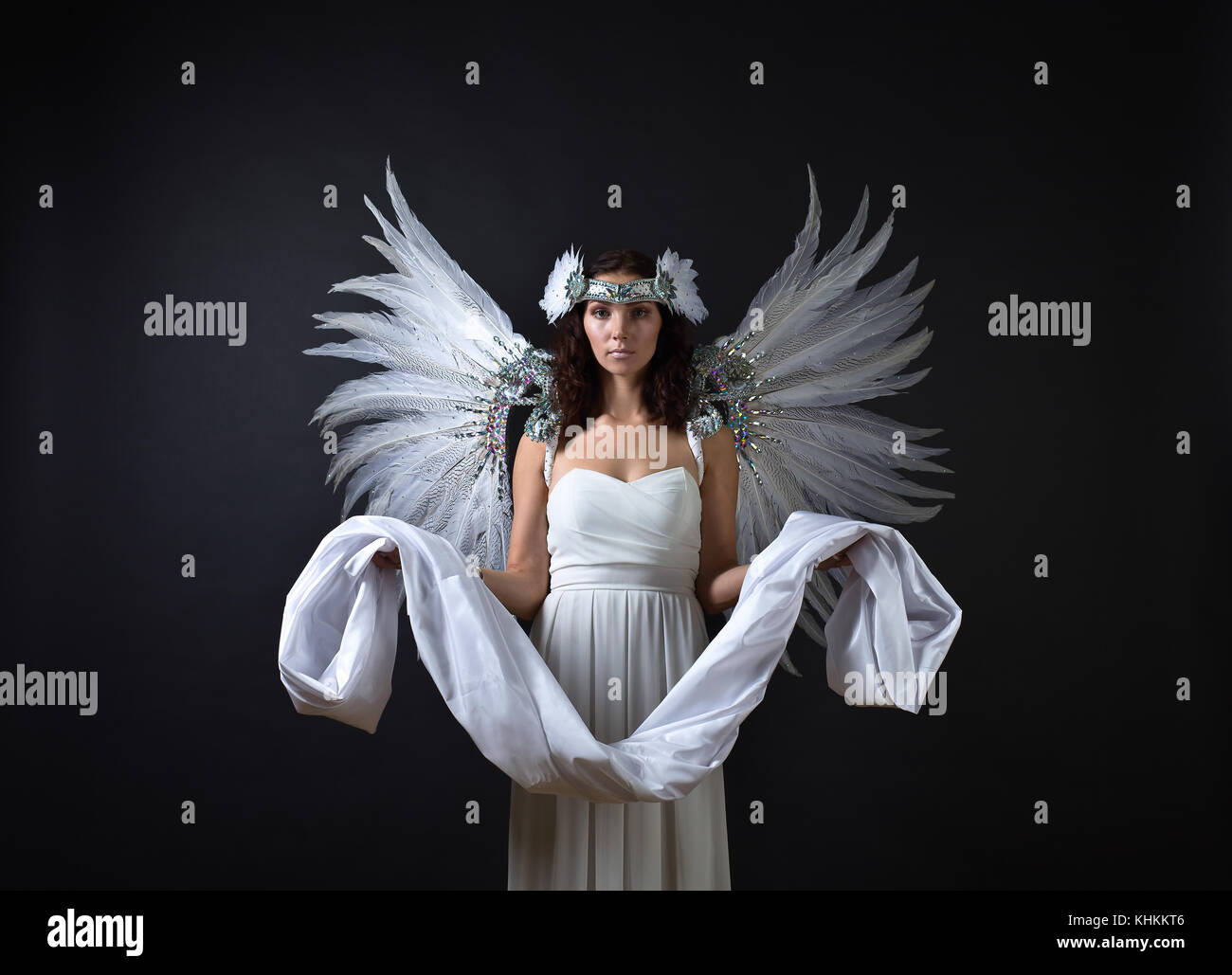 Giovane Bella Donna In Abito Bianco Con Ali D Angelo E Convogliatore In Mani Sfondo Nero Foto Stock Alamy