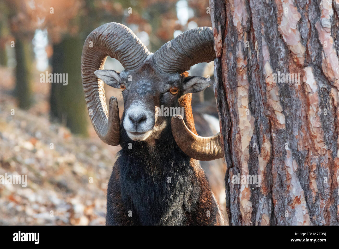 I Mufloni Nella Foresta Nella Stagione Invernale 3 Mufloni Salire Su Di Una Ripida Collina Animali Selvatici Con Enormi Corna Nella Natura Habitat La Messa A Fuoco Su Th Foto Stock Alamy