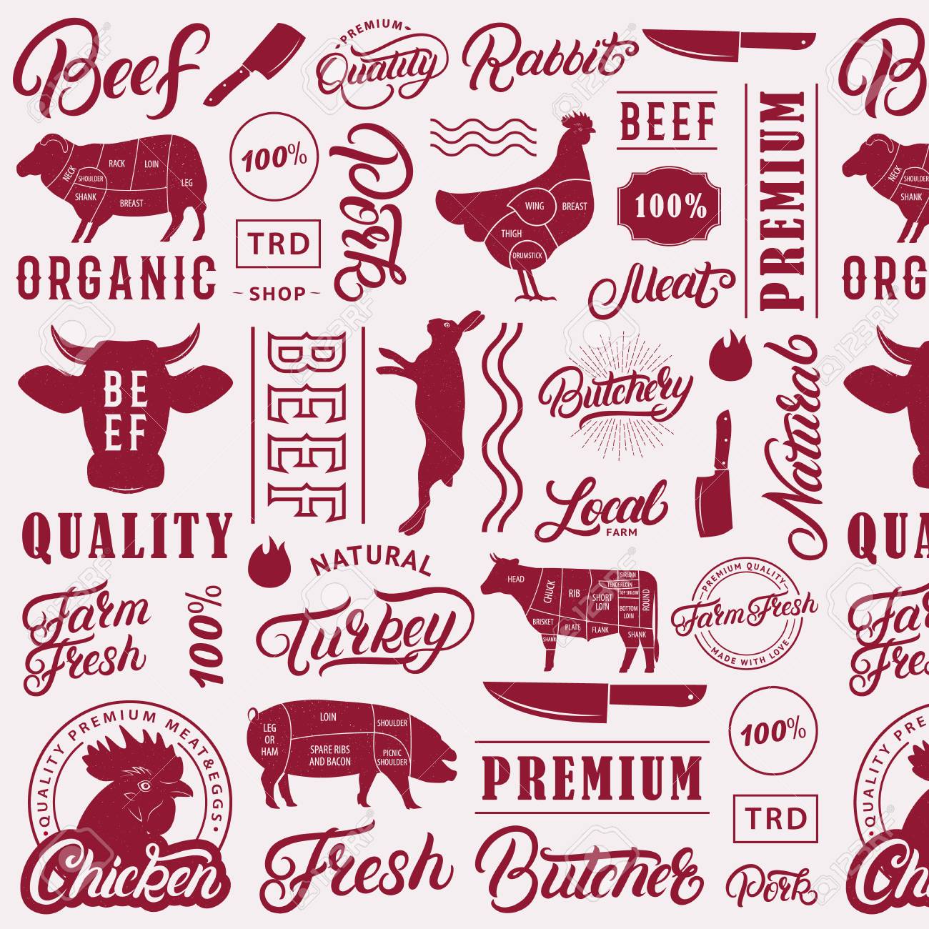 Vettoriale Modello Tipografico Di Macelleria Senza Soluzione Di Continuita Sfondo Sagome Di Animali Da Fattoria E Scritte A Mano Scritte Con Elementi Di Testo Per Generi Alimentari Negozi Di Carne Imballaggi