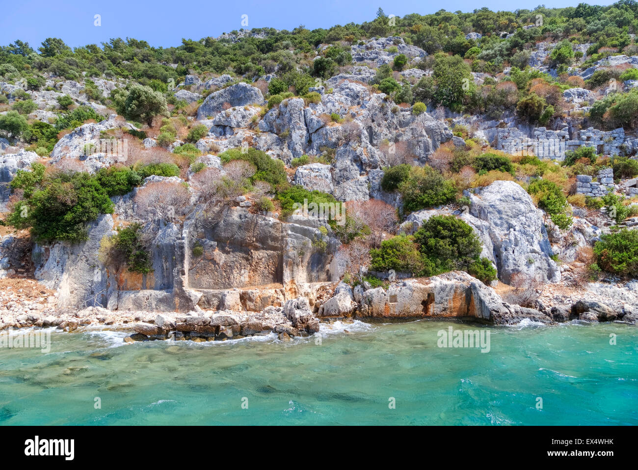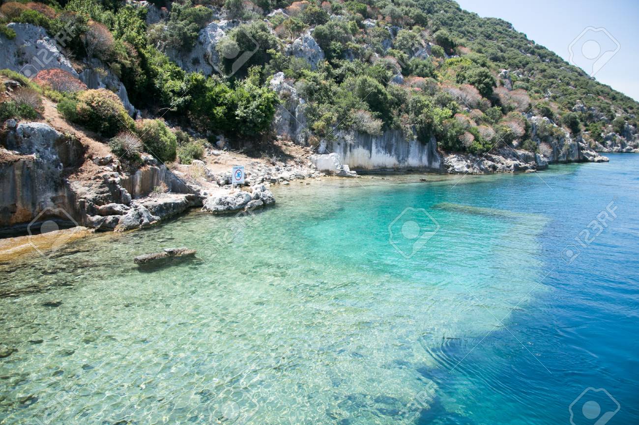 Immagini Stock Citta Sommersa Di Kekova Nella Baia Di Vista Uchagiz Dal Mare In Provincia Di Antalya Della Turchia Con Rocce Marine Turchesi E Cespugli Verdi Con Resti Della Citta Antica