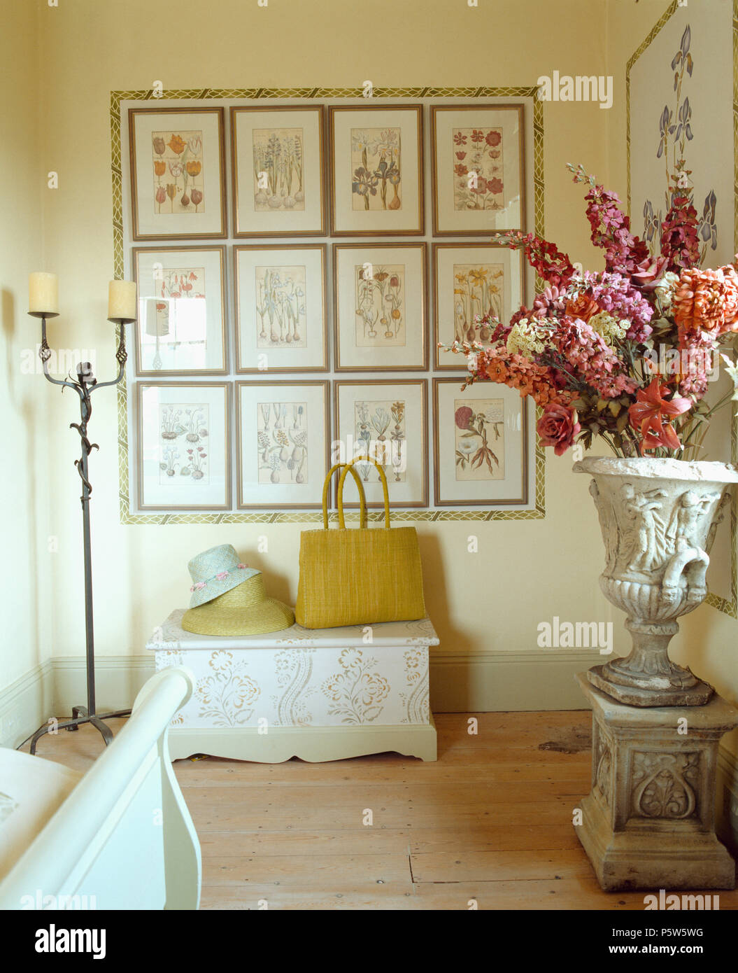 Collezione Di Antiche Stampe Floreali Sopra Impresse Petto Nella Camera Da Letto Del Paese Con Fiori Estivi In Urna Di Pietra Foto Stock Alamy