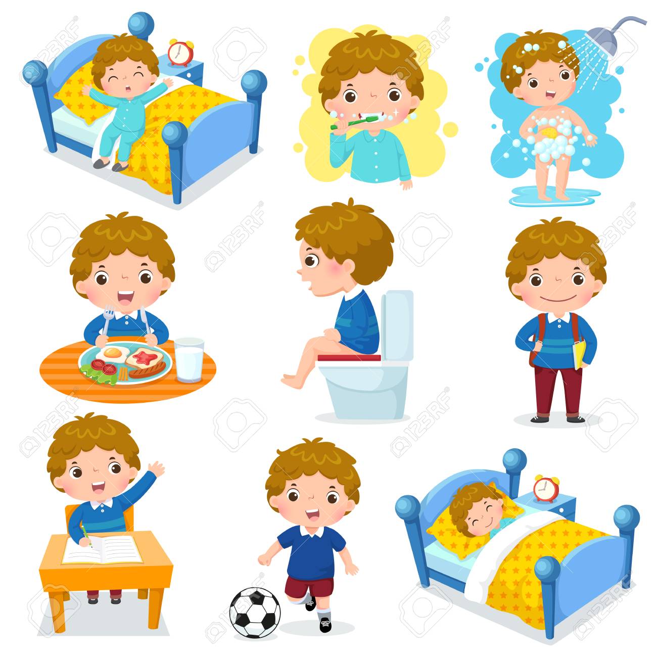 Vettoriale Illustrazione Delle Attivita Quotidiane Di Routine Per I Bambini Con Ragazzo Carino Image 96069152