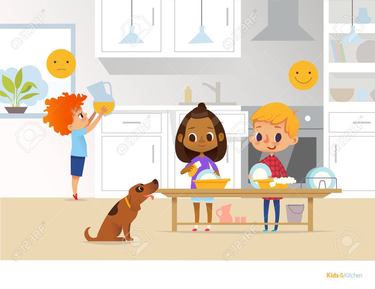 Vettoriale Bambini Che Fanno Attivita Quotidiane Di Routine In Cucina Due Bambini Che Lavano I Piatti E Il Ragazzo Rosso Che Tiene La Brocca Con Succo D Arancia Concetto Di Ambiente Montessori