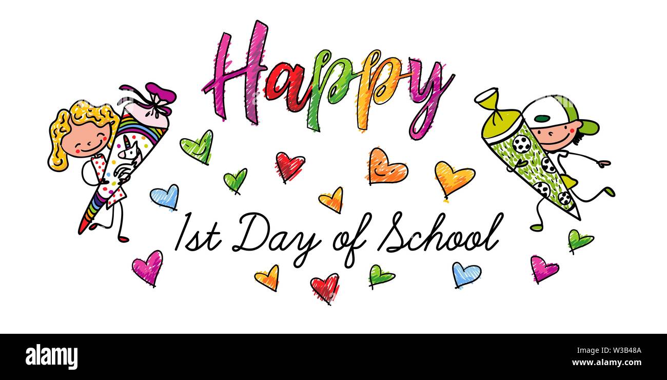 Primo Giorno Di Scuola Eccitato Prima Livellatrici Con La Scuola Coni Colorata Disegnata A Mano Cartoon Adatto Per Orizzontale Un Invito O Un Biglietto Di Auguri Immagine E Vettoriale Alamy