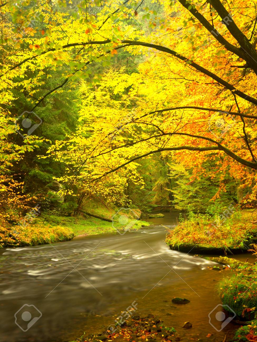 Immagini Stock Escursione Nella Natura Autunnale Serata Al Fiume Nei Brillanti Colori Autunnali Umidita Nell Aria Dopo Una Giornata Di Pioggia Image 89365115