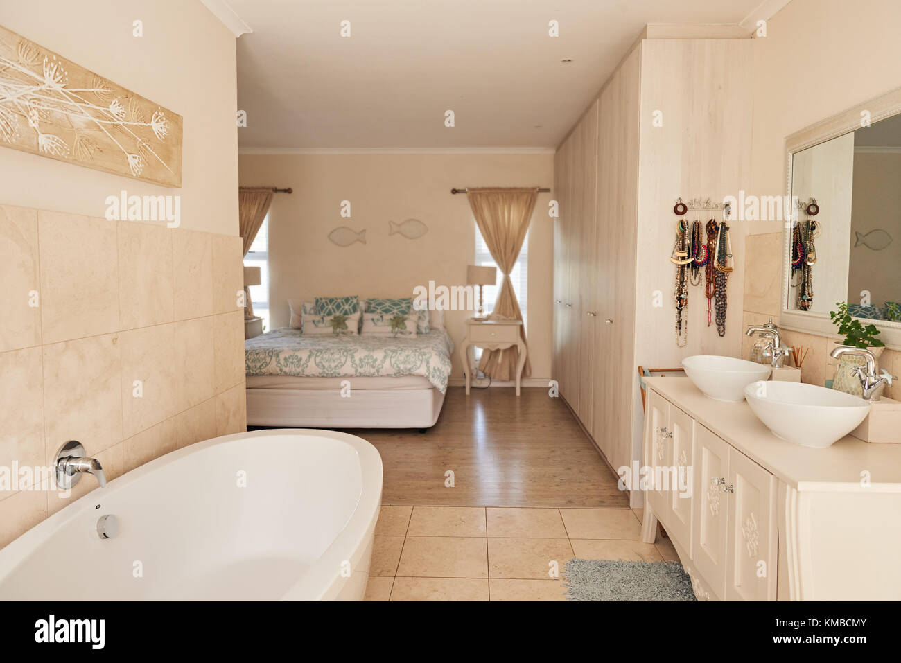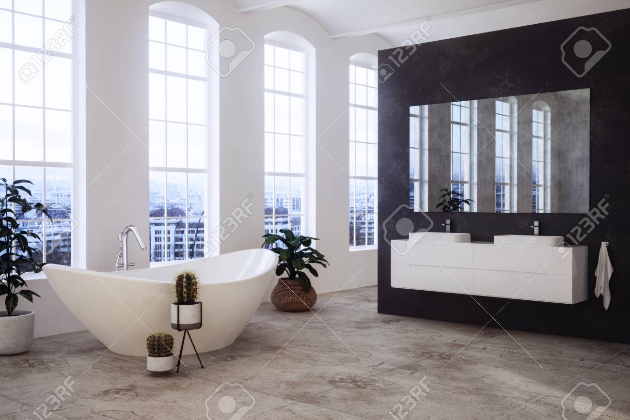 Immagini Stock Spazioso Ed Elegante Bagno Moderno Soleggiato Con Grandi Finestre Che Si Affacciano Su Una Citta Vasca Da Bagno A Forma Di Barca E Vanita Gemelle Su Una Parete Divisoria