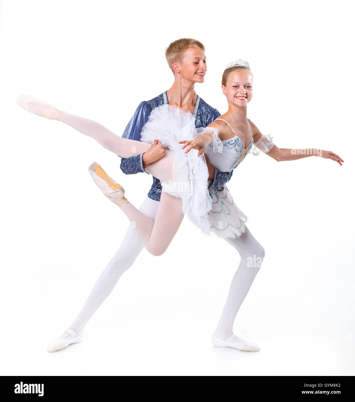 Equilibrio Ballerini Classici Aggraziati Che Ballano Isolati Su Sfondo Bianco Studio Coppia In Vestiti Tenera Come Un Cigno Bianco Caratteri Il Concetto Di Grazia Artista Movimento Azione E Movimento Foto Stock