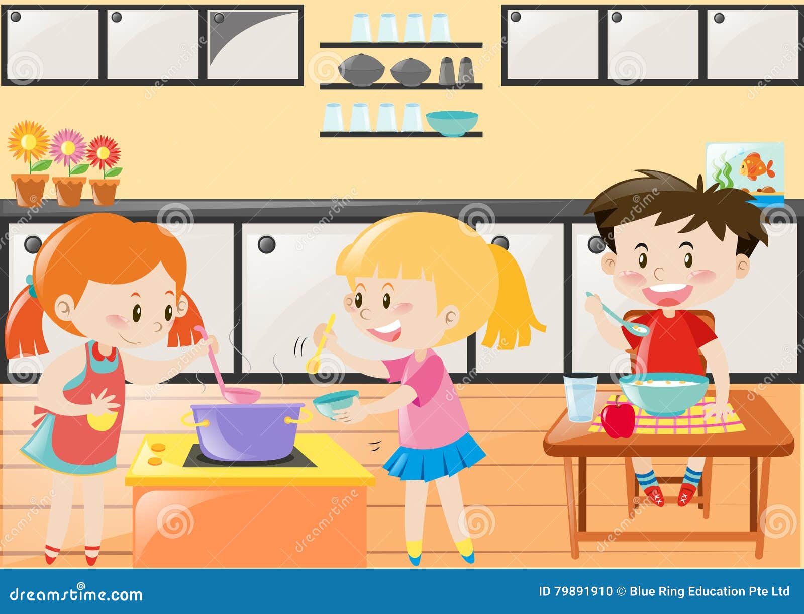 Tre Bambini Che Cucinano E Che Mangiano Nella Cucina Illustrazione Vettoriale Illustrazione Di Clip Giovent 79891910