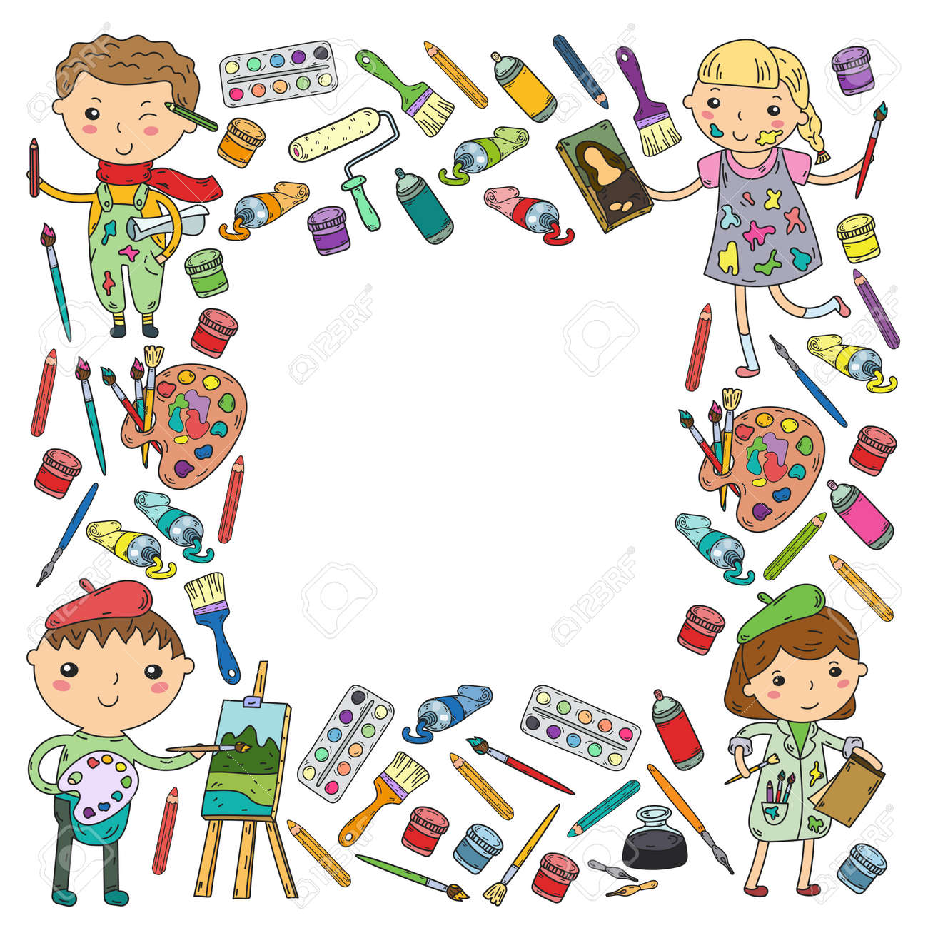 Modello Di Confine Con Bambini Che Dipingono Sulla Tavolozza Vettore Premium
