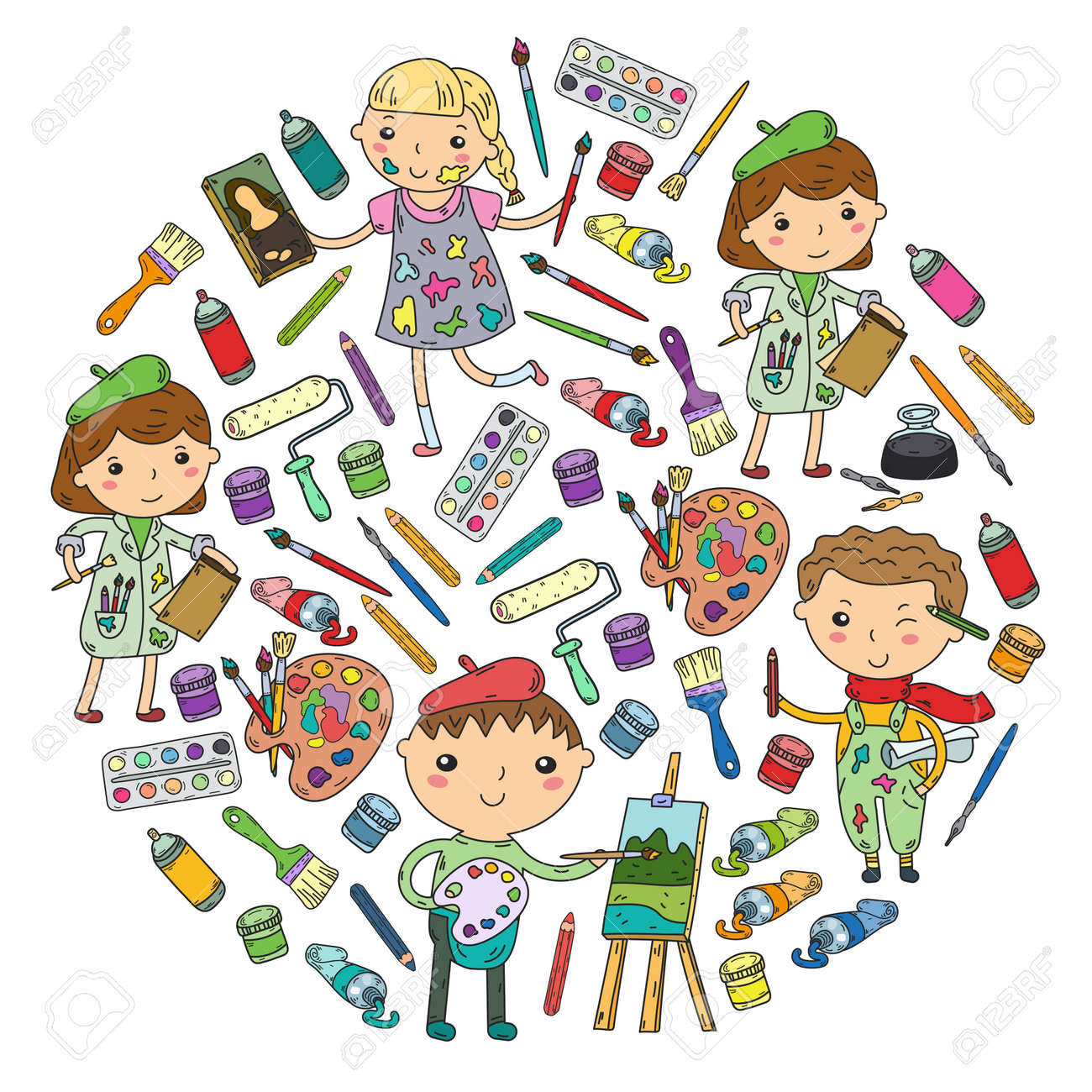 Vettoriale Creativita Dei Bambini Scuola Materna Arte Scolastica Ragazzi E Ragazze Che Disegnano E Dipingono Quadri Scuola Di Arte E Design Per Bambini Image 92187448