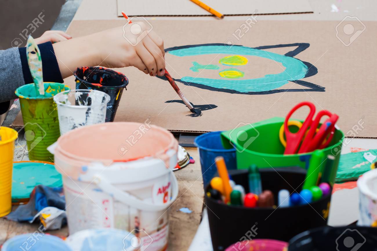 Immagini Stock La Creativita Dei Bambini La Mano Che Disegna Un Bambino Dipinge Lattine Di Vernice Sul Tavolo Messa A Fuoco Selettiva Image 63678078