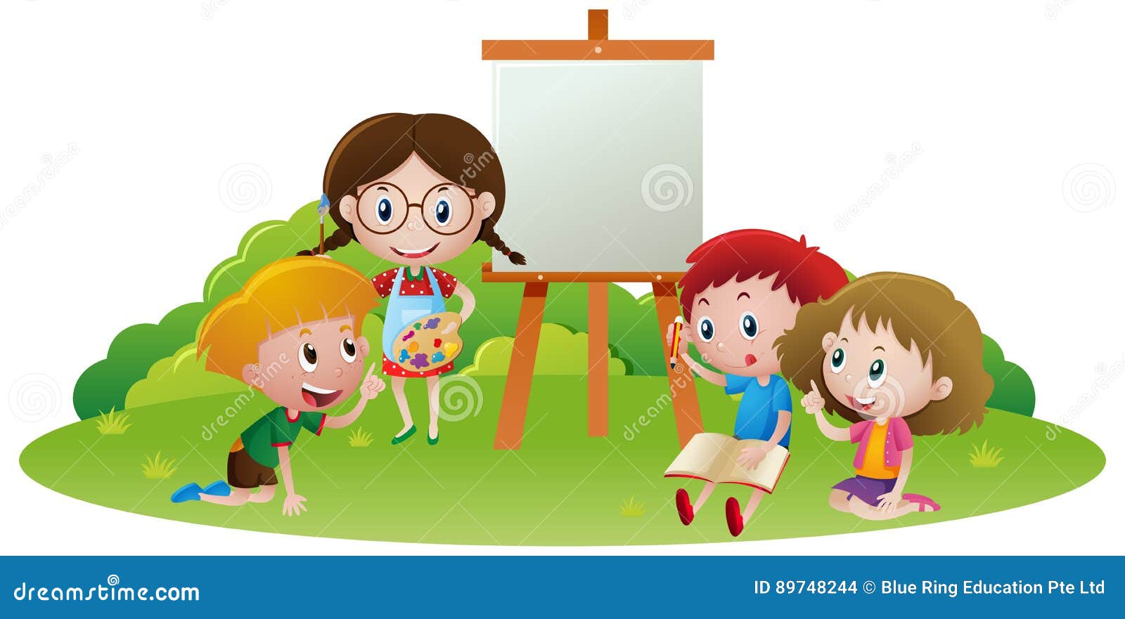 Bambini Che Dipingono E Che Scrivono Nel Giardino Illustrazione Vettoriale Illustrazione Di Ragazzo Carattere 89748244
