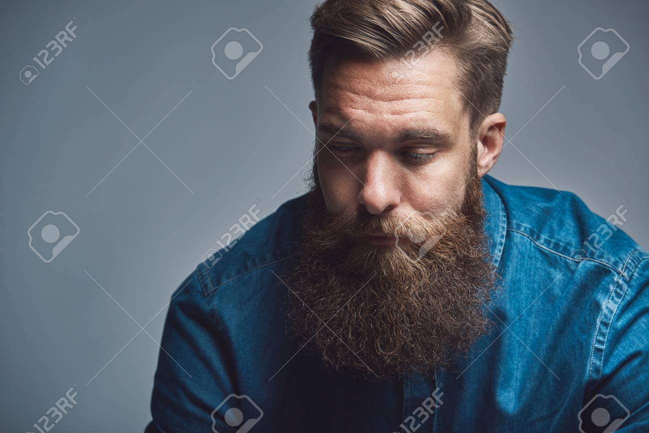 Immagini Stock Giovane Alla Moda Con Una Barba Lunga Che Osserva In Profondita Nel Pensiero Mentre Sedendosi Contro Una Priorita Bassa Grigia Image 90590830