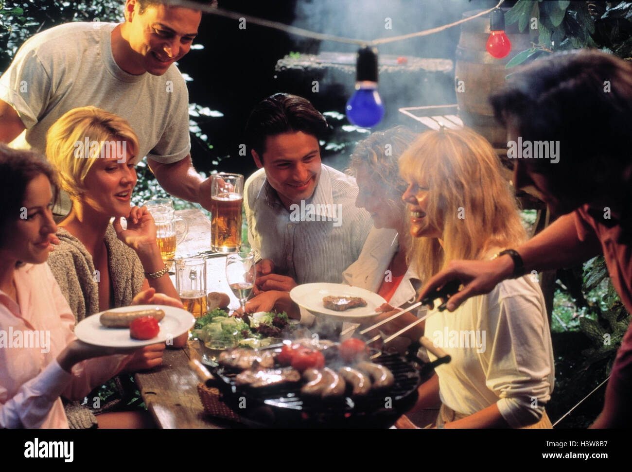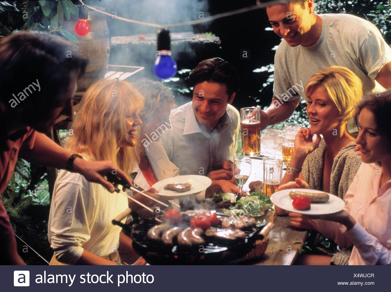 Party In Giardino Donne Uomini Dispone Di Un Barbecue Celebrare Felice Sera Fuori Giardino Festa Grill Festa Festa Divertente Cricca Amici Grill Party Bevande Mangiare Grigliate Di Carne Salsicce Grill Da Tavolo