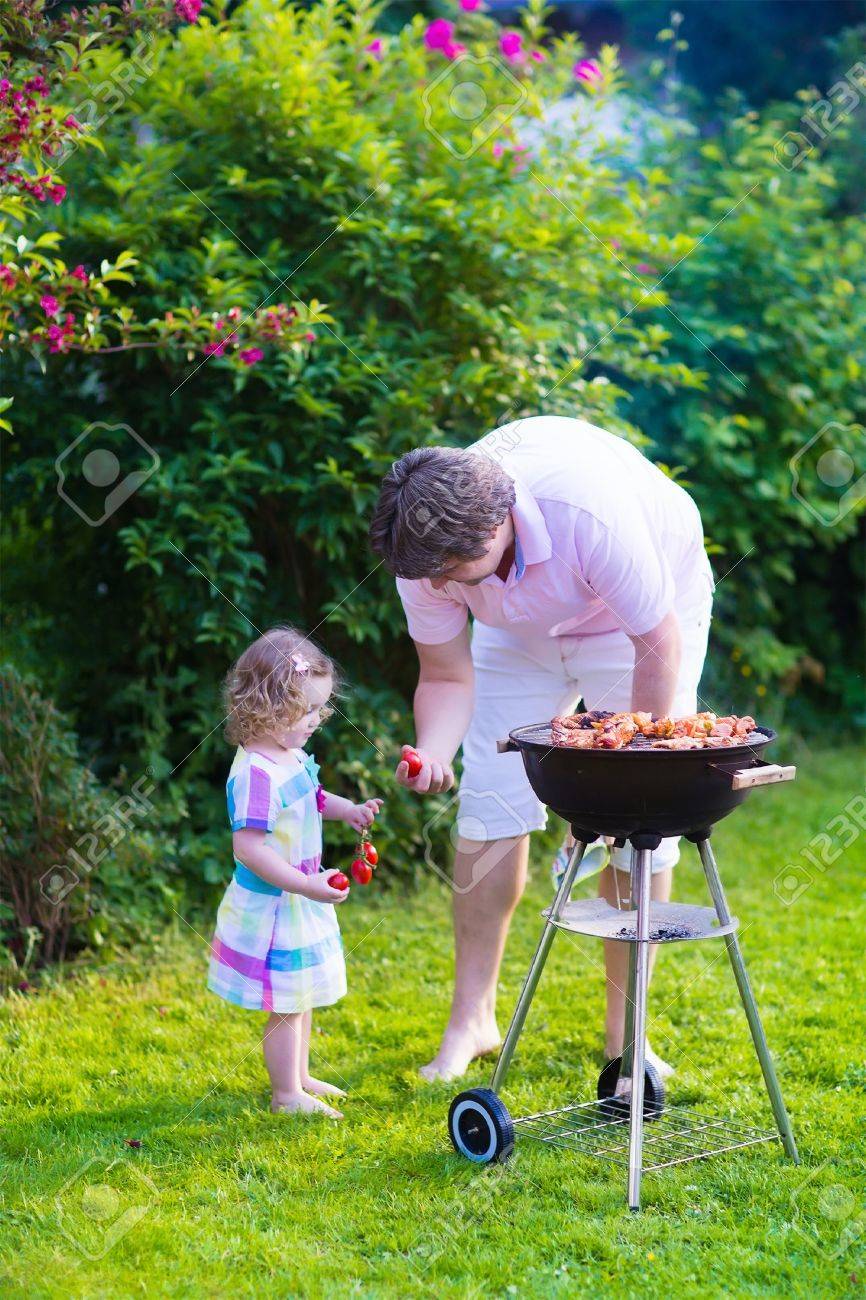 Immagini Stock Padre E Figlio Grigliate Di Carne Famiglia Campeggio E Godersi Un Barbecue Papa E Figlia A Preparare Barbecue Bistecche E Salsicce Genitori E Bambini Che Mangiano Griglia Pasto All Aperto