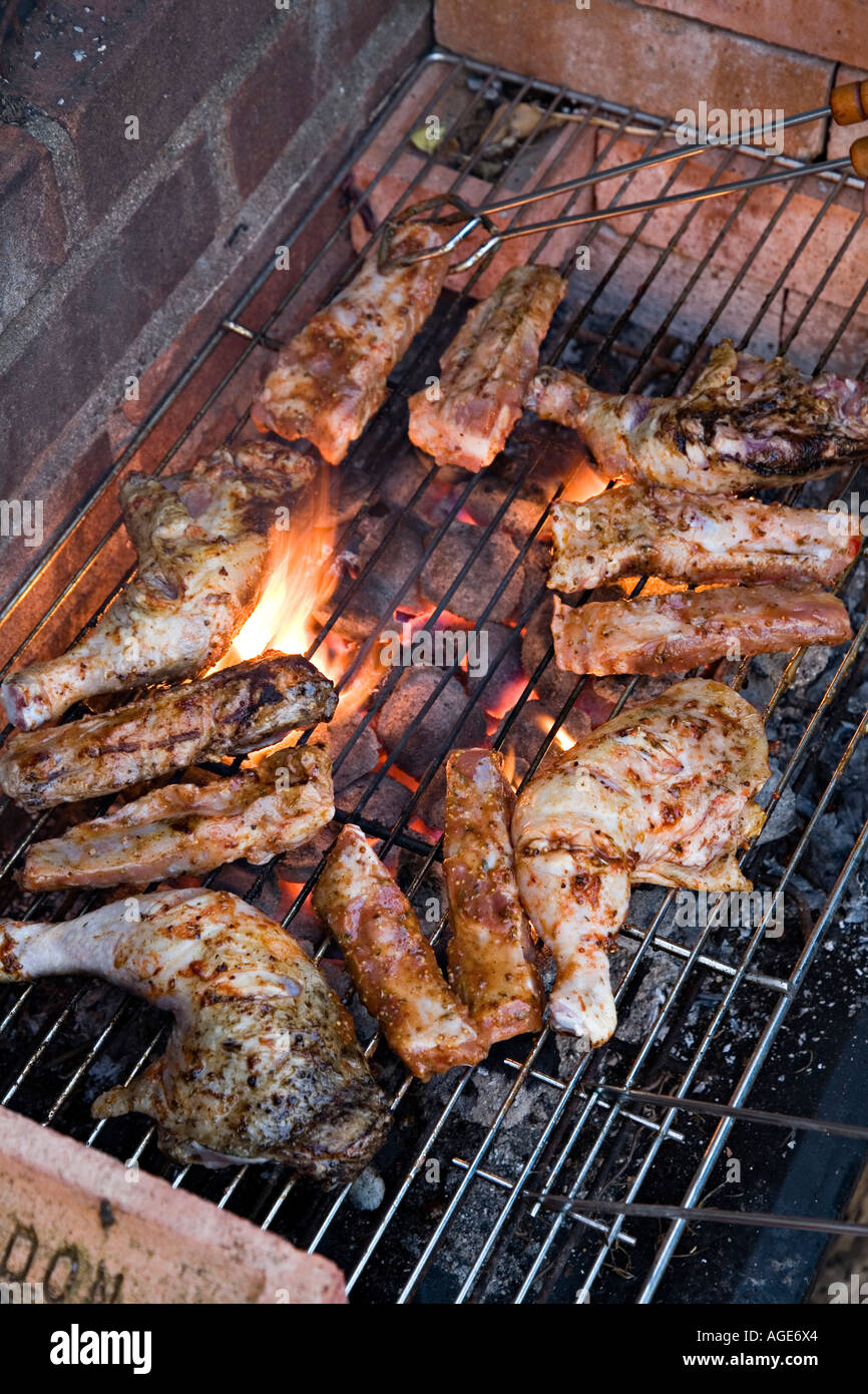 Marinaded Spare Ribs And Chicken Portions Being Turned On A Barbecue Stock Photo Alamy
