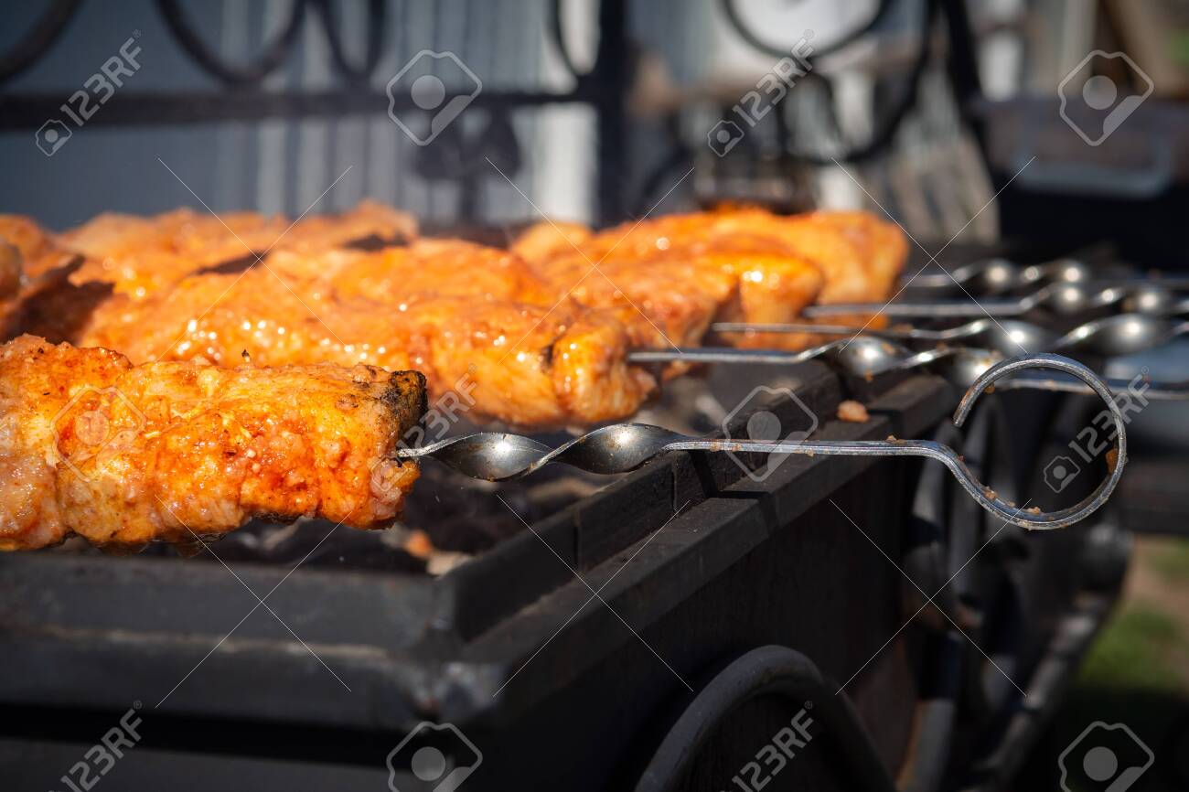 Immagini Stock Pork On Skewers Cooked On Barbecue Grill Image 146469940