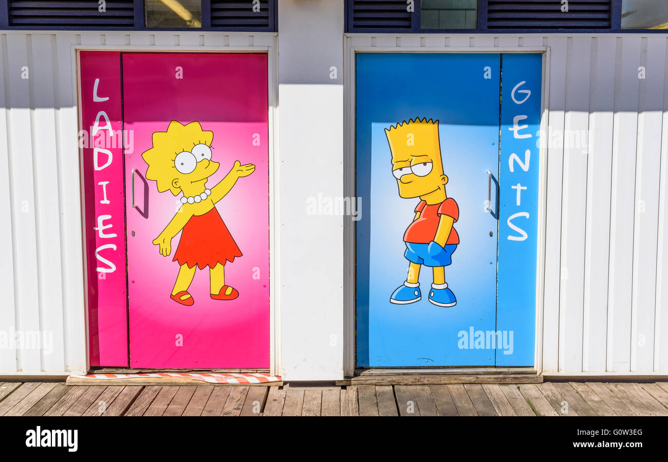I Personaggi Dei Cartoni Animati Bart E Lisa Simpson Raffigurato Sulla Porta Di Un Wc Pubblico Su Central Pier Di Blackpool Lancashire Regno Unito Foto Stock Alamy
