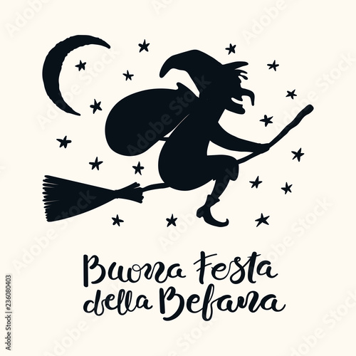 Hand Written Italian Quote Buona Festa Della Befana Happy Holiday Of Befana With Flying Witch Isolated Objects On White Hand Drawn Vector Illustration Design Concept Element For Card Banner Buy This