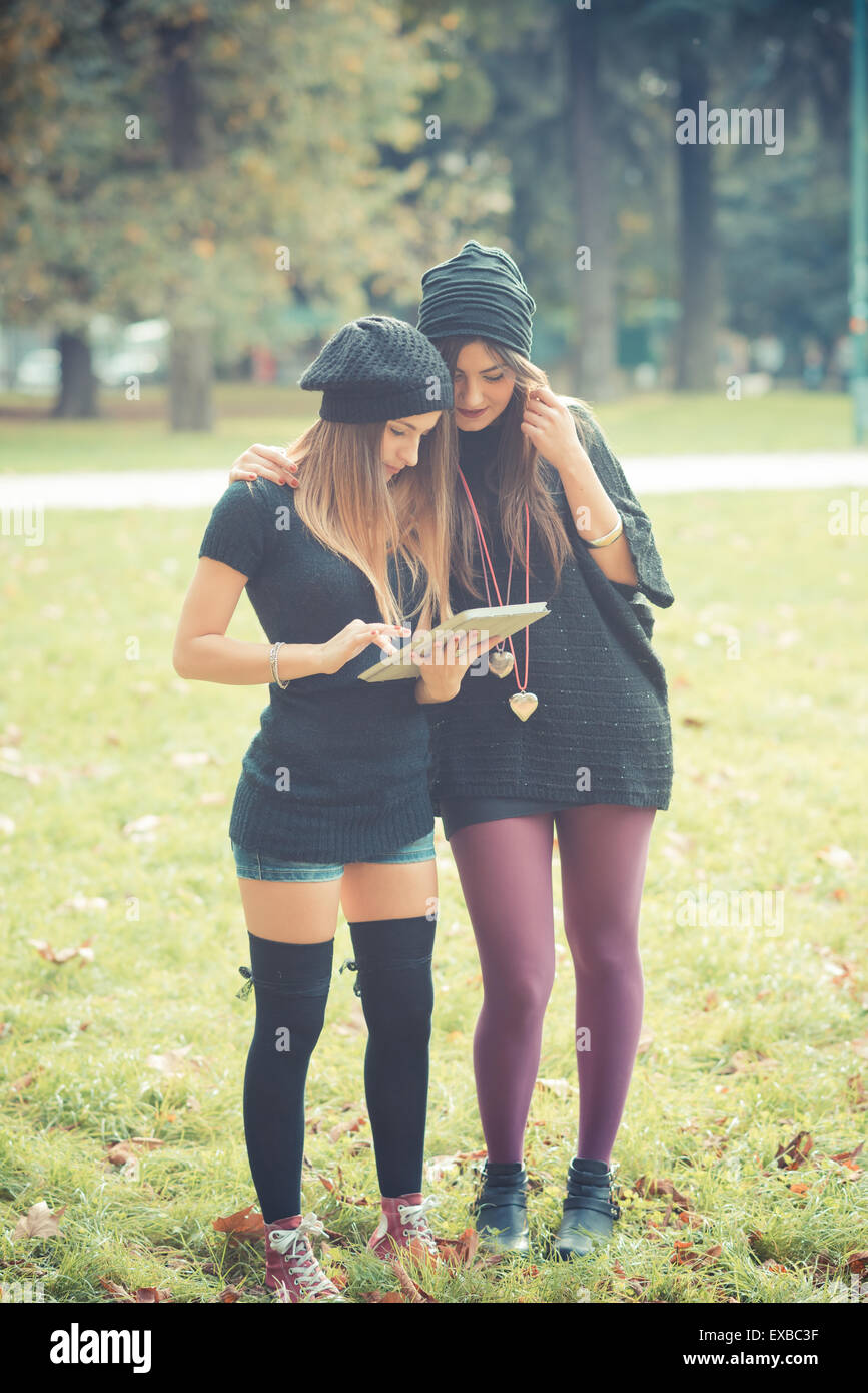 Coppia Giovane Di Belle Donne Ragazze Autunno Utilizzando Tablet Outdoor Foto Stock Alamy