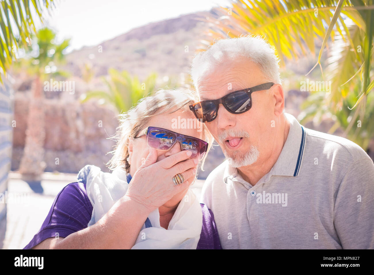 Belle Facce Di Ridere Per Una Coppia Di Anziani In Vacanza Le Palme E La Luce Del Sole E Di Indossare Occhiali Da Sole Bello E Divertente Il Concetto Di Vita Foto