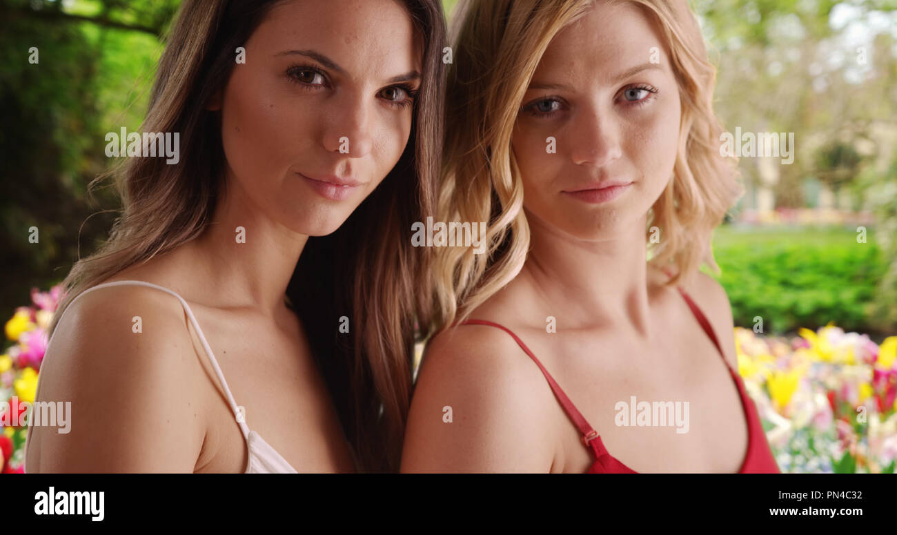Coppia Di Belle Donne In Posa Casualmente Da Colorati Prati Di Fiori Foto Stock Alamy