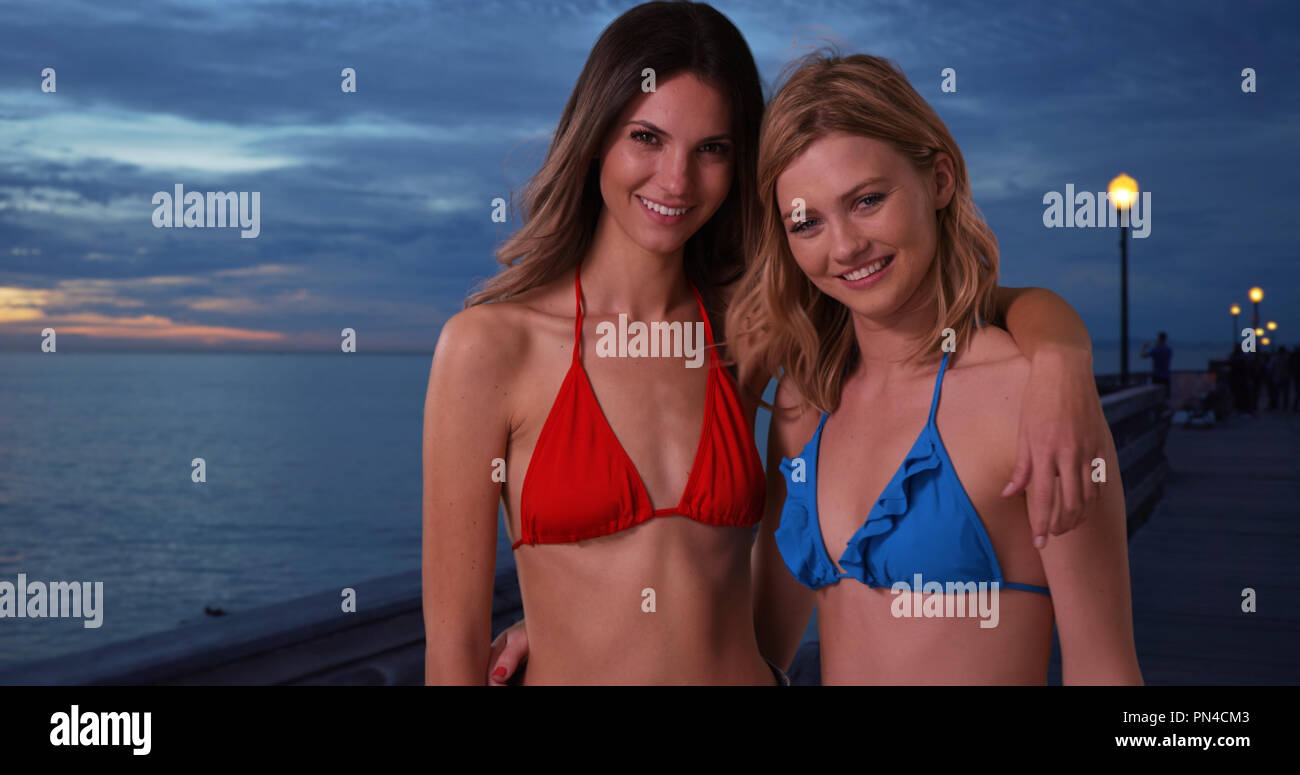Coppia Di Belle Ragazze In Bikini A Sorridere E Ridere Per Fotocamera Su Un Molo Al Tramonto Foto Stock Alamy