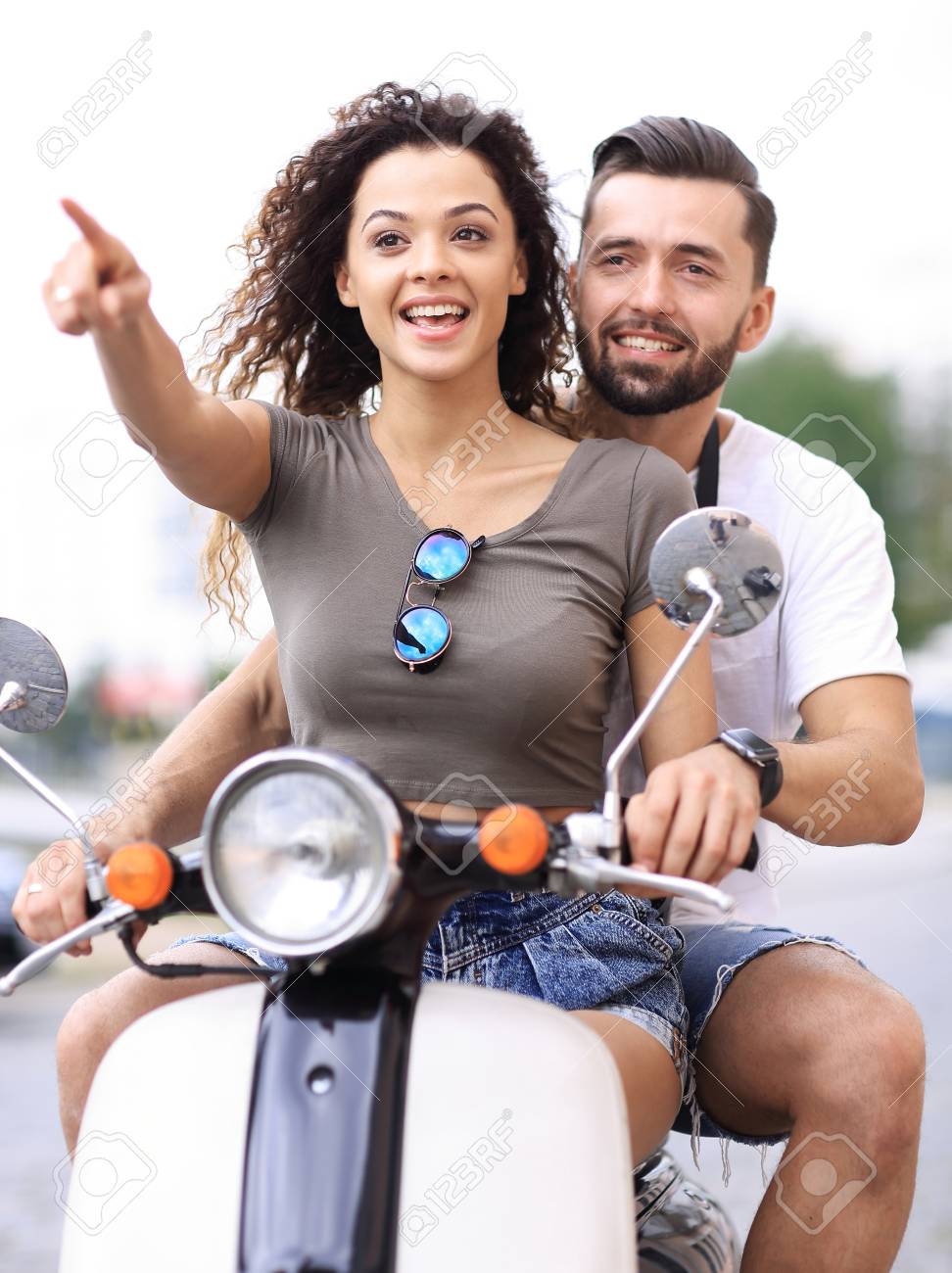 Immagini Stock Giovani Belle Coppie Che Guidano Sulla Strada Della Citta Della Motocicletta Image 92925898