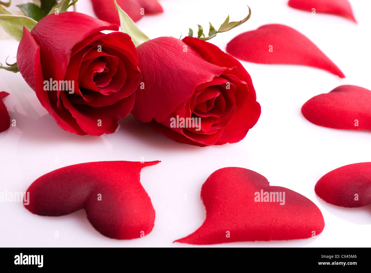 Due Bellissime Rose Rosse Con Cuori Su Sfondo Bianco Foto Stock Alamy