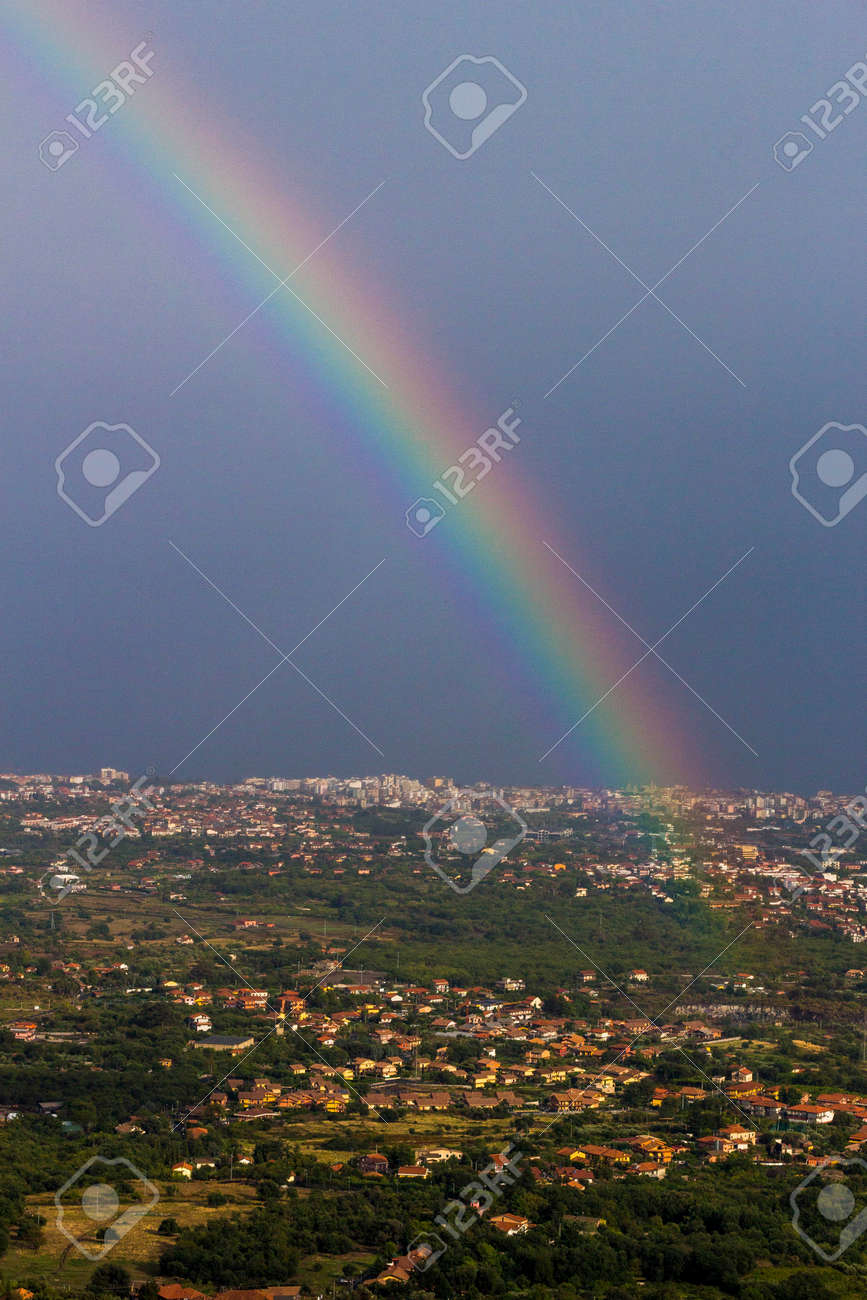 Immagini Stock Un Bellissimo Arcobaleno Sulla Costa Orientale Della Sicilia Ai Piedi Del Monte Etna E La Citta Di Acireale Image 46810024