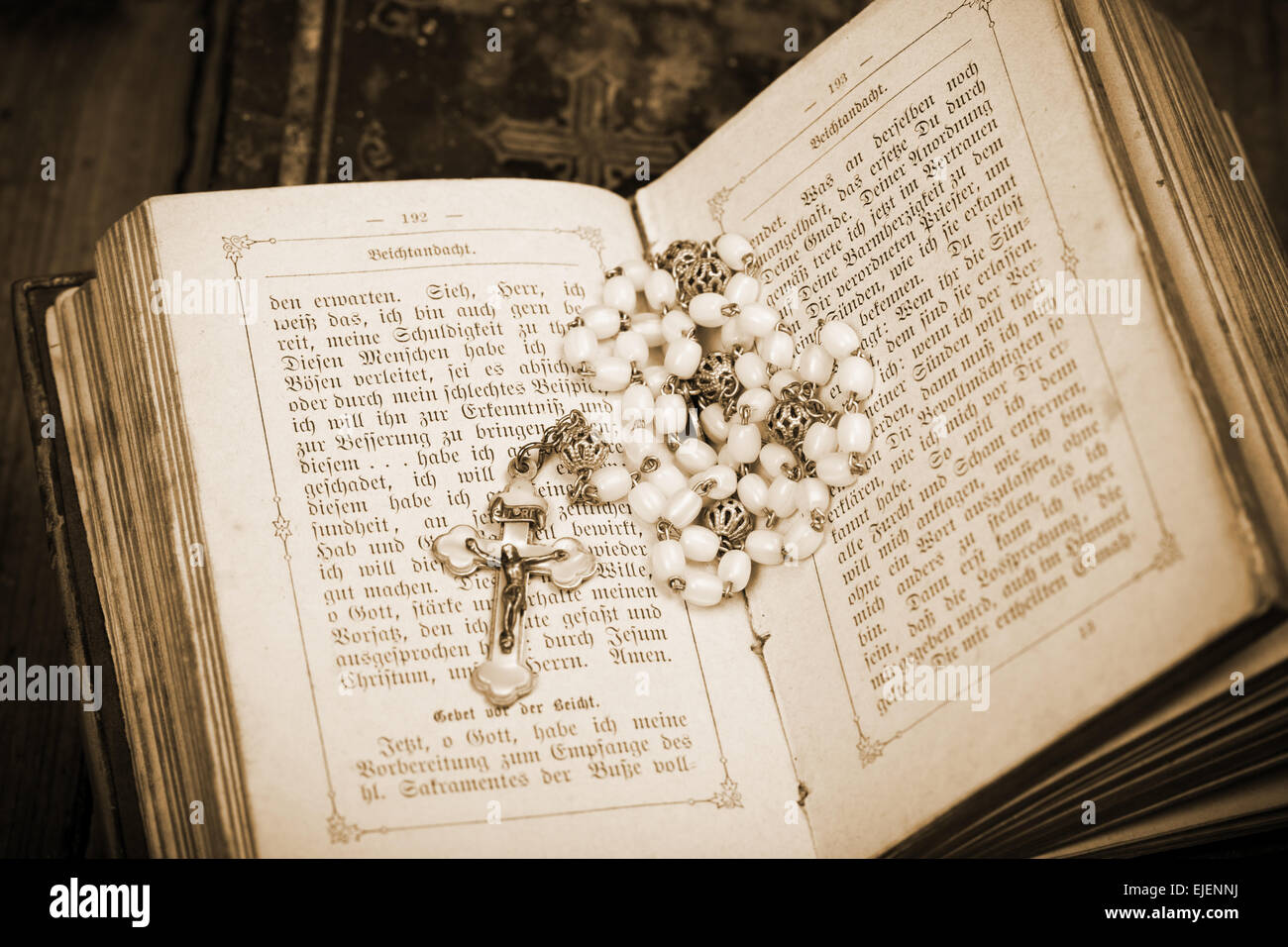 Vintage Crocifisso Con La Figura Di Gesu Sui Lati Della Bibbia Aperta Seppia Foto Stock Alamy